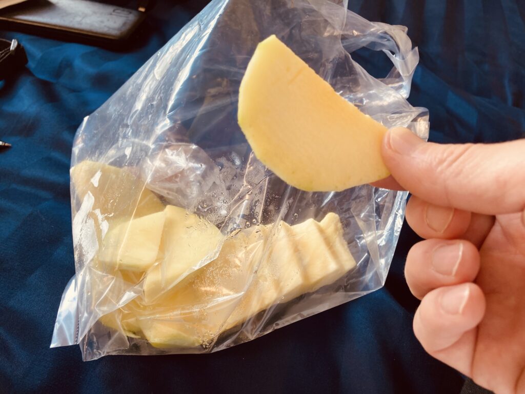 シャキシャキとした歯ごたえと酸味、少しリンゴのような風味。